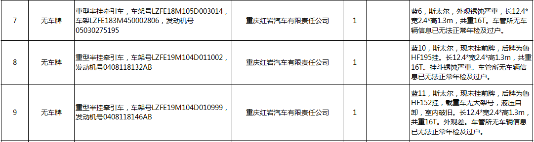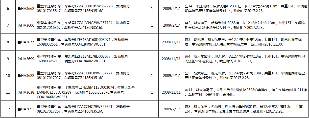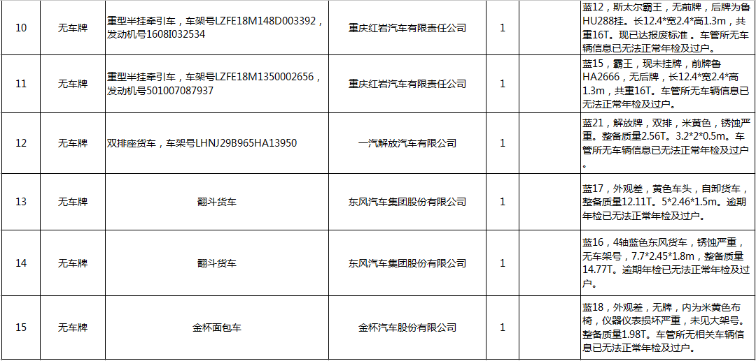 5、脫審貨車12輛(詳見清單),參考價27.2萬元,保證金5萬元。