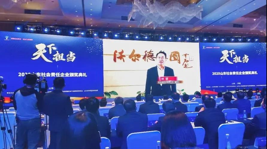2021年4月23日下午,“天下擔當”2020山東社會責任企業頒獎典禮在山東濟南云鼎大廈隆重舉行。沃爾德集團榮獲“2020山東社會責任企業”稱號,董事長林擘親臨活動現場并接受表彰。