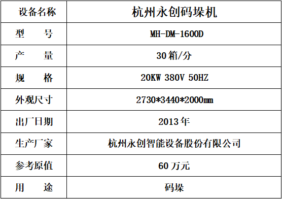 標的六:永創(chuàng)碼垛機,起拍價:15萬元(不含稅),標的設(shè)有保留價,競買保證金3萬元。已拆機,設(shè)備完好。