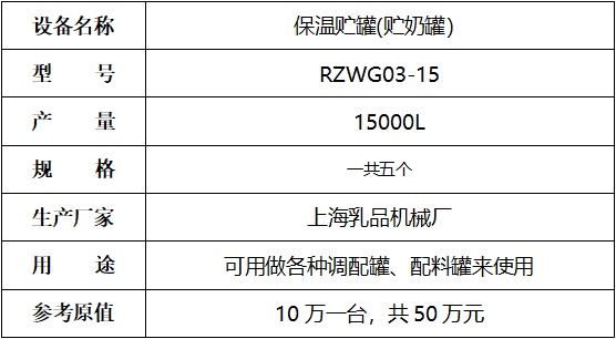 標的七:上海乳品廠5個儲奶罐,起拍價:40萬元(不含稅),標的設(shè)有保留價,競買保證金8萬元。已拆機,設(shè)備完好。