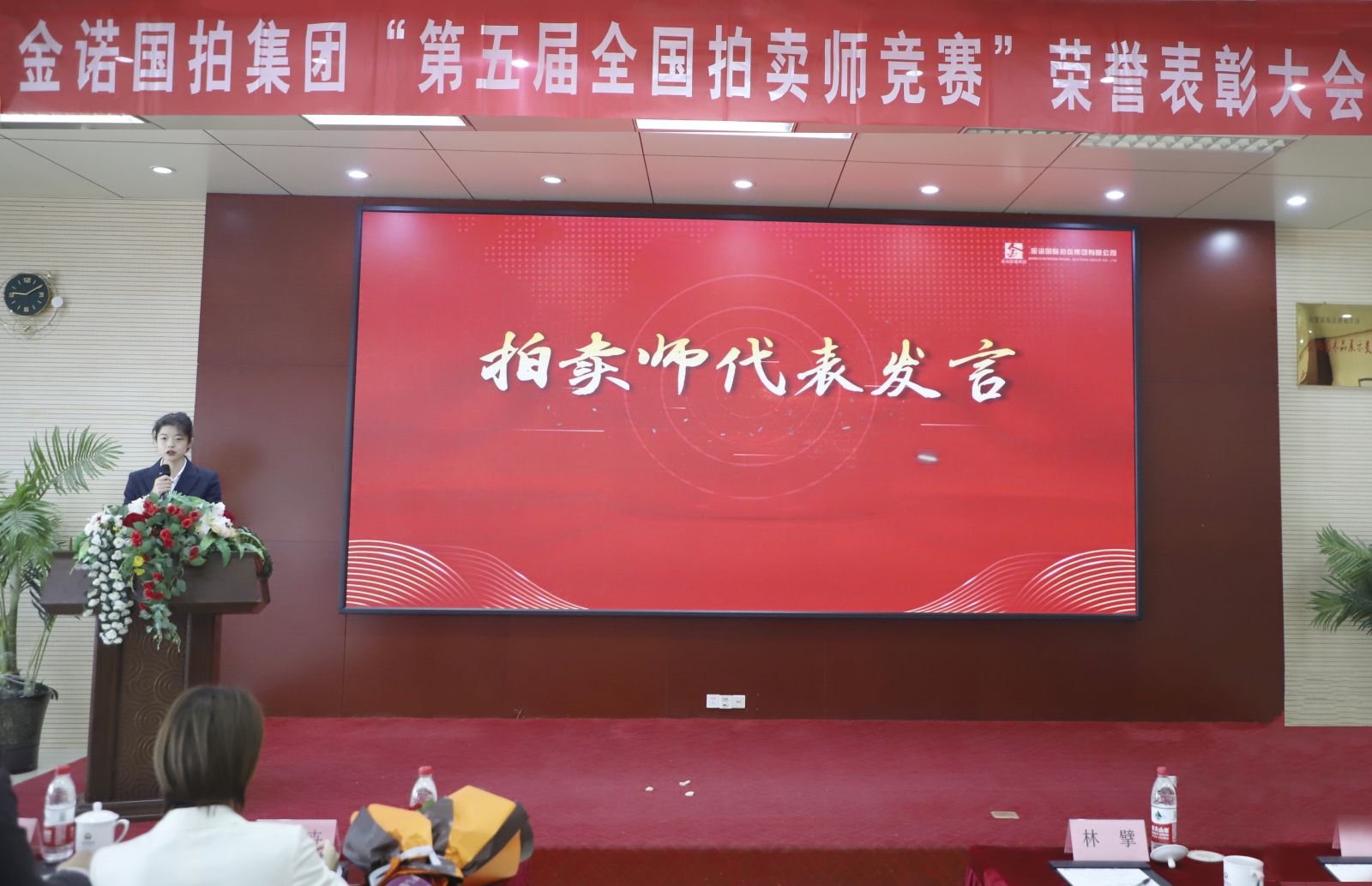 我是第35期全國拍賣師執業資格考試合格人員劉雨佳。此時此刻作為新拍賣師代表在此發言,我感到無比榮幸。首先我要對在第五屆全國拍賣師競賽中取得佳績的三位優秀拍賣師表達祝賀。我們將以三位優秀拍賣師為榜樣,汲取奮進力量,展現金諾國拍集團新一代拍賣師的風采。